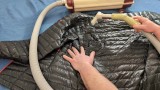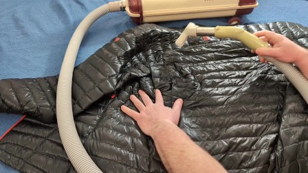 Vacuuming Dark Shark Ghost Whisperer Down Jacket with Vintage Electrolux Vacuum Cleaner